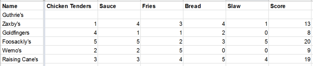 For each competitor, I ranked them for the taste of the tenders, bread, fries, slaw, and sauce. We’ll also discuss some of the intangibles and value for each in the results section.