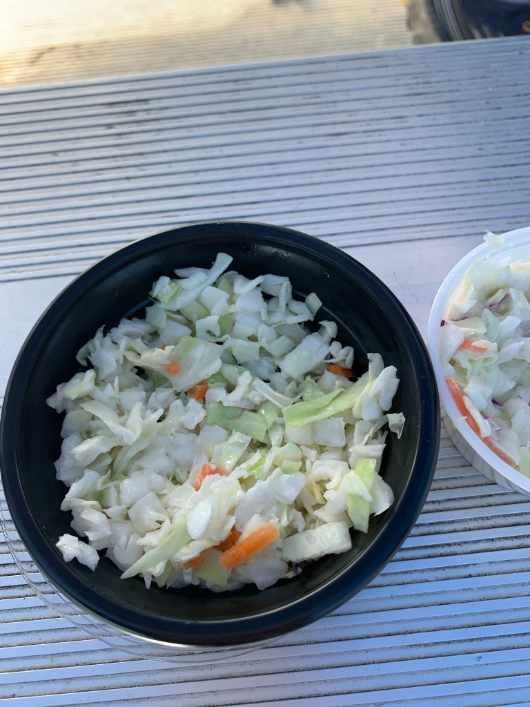 You can’t see the tenders here, as they’re strategically covered with toast. I’d describe them as small, shriveled, and brown. Bonus shot of this pathetic slaw, which is literally just cabbage: