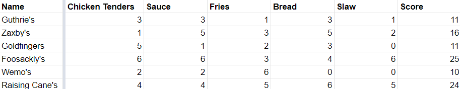 Overall, I think Guthrie’s still deserves a ton of credit for being the very first chicken tender joint, founded in 1965. It’s changed since I first had it as a kid, and I see they’re expanding into offering wings and other items beyond the core chicken – fries – slaw – sauce – toast formula. It ended up in the middle of the pack in our lineup, and so not worth driving to vs Foosackly’s or Cane’s if you have the chance.